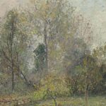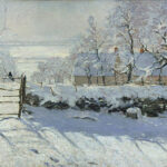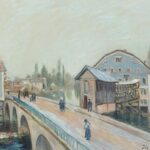 Dans Gelée blanche à Éragny, Pissarro ne représente pas une neige décorative. La gelée est un givre perceptible par la température des couleurs. Les bleus et mauves des ombres s’opposent aux jaunes pâles du ciel. Le froid est ressenti sans recours à un blanc éclatant. Chez Sisley, dans les versions du Pont de Moret-sur-Loing peintes à la fin des années 1880, les ciels bleus froids restent respirables grâce à des touches orangées et ocre rosé. Ces touches sont présentes dans les berges, la maçonnerie ou les reflets. L’orange n’est jamais frontal. Il empêche simplement le bleu de s’aplatir.